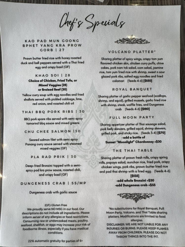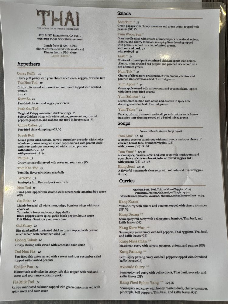 THAI - The House Of Authentic Ingredients, located in Sacramento, CA, is a hidden gem offering a mix of traditional and unique Thai dishes. With a cozy and inviting atmosphere, this restaurant caters to all, including vegans and vegetarians. The menu features dishes bursting with authentic flavors, such as the Chicken Larb salad, Papaya Salad, Pad Thai, and Spicy Peak Gai Tod. Customers rave about the quality of service and food, making it a must-visit spot for a memorable dining experience. The outdoor seating area is perfect for larger parties and families. Overall, THAI - The House Of Authentic Ingredients is a great choice for those seeking delicious, authentic Thai cuisine in a warm and welcoming setting.